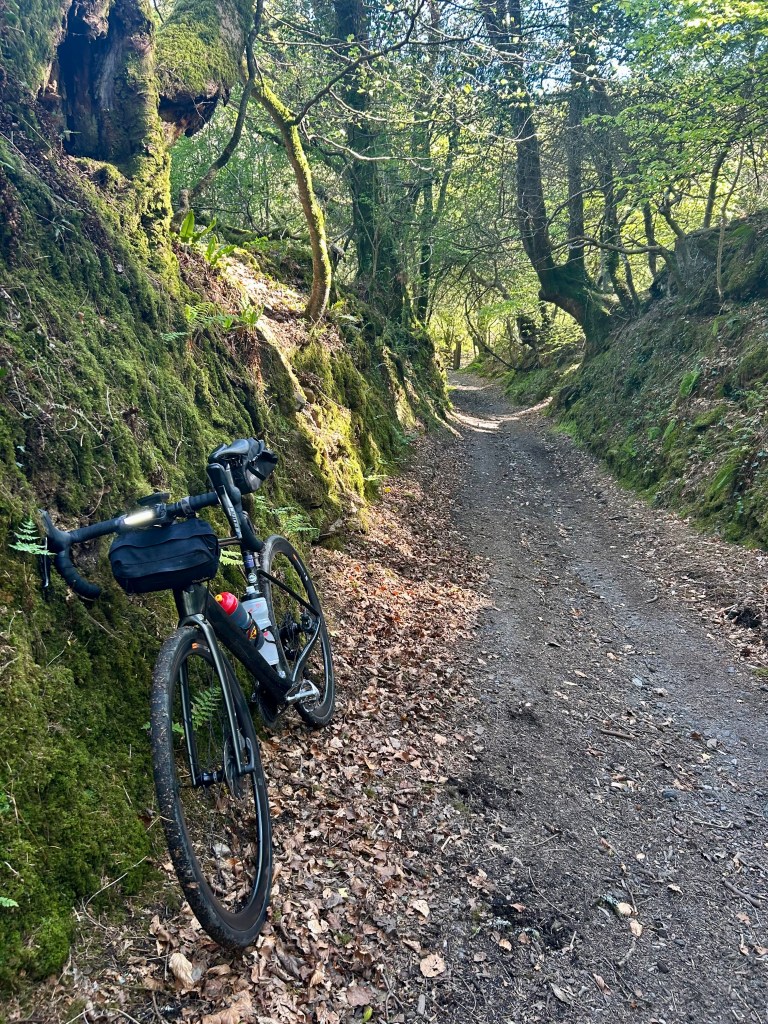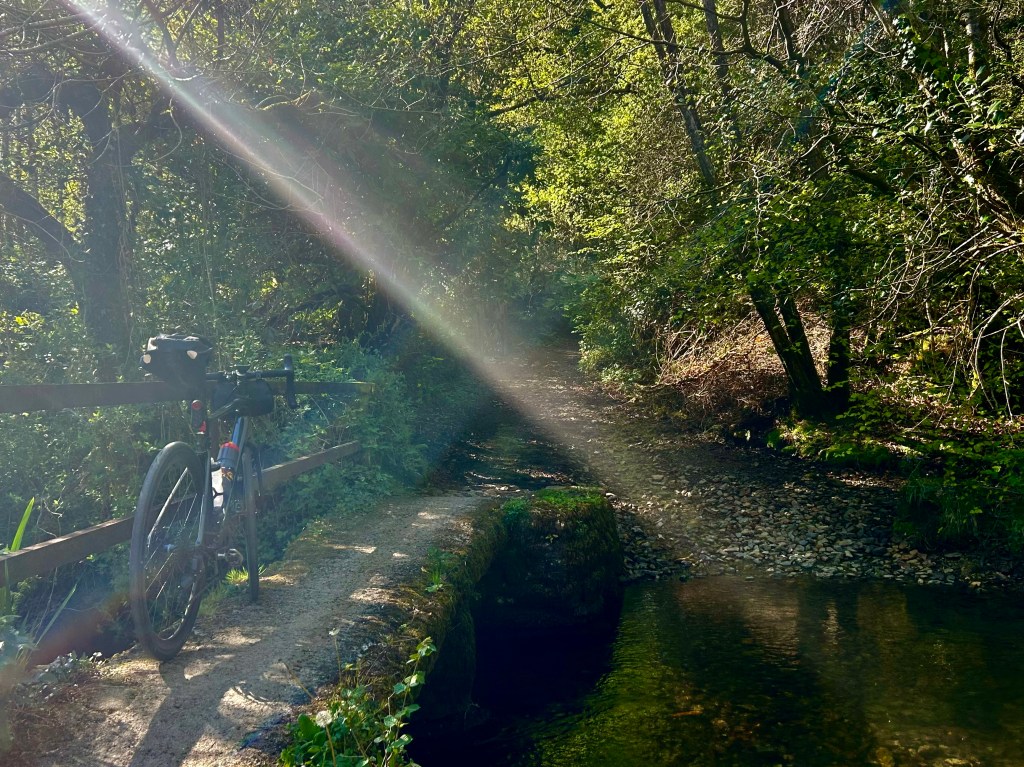 The day winds on too. I am beyond the moor now, hung between the hills left behind and Dartmoor ahead which is a purple hulking presence on the horizon where I will not go today but perhaps another day. For some reason I thought the steep hills were over now but they have only just begun. A muscular flexing of the granite beneath the skin and I have to flex with it, riding uphill through what we now call Atlantic rain forest not woodland, sunlight slanting through holes in the tree cover, dust suspended in smoky light, my breath too fast and my heart complaining. An ancient and secluded forest, mossy and green, lichen hanging from small oaks as the lane twists and rises and will not end. I am looking for a good reason to be here, nauseous and unable to eat. The infernal machine creaks with displeasure, she dislikes this steepness, this unrelenting uppity-ness as much as me. I am losing beauty to fear, wonder to pain, serenity to impatience. I want this to be over now. At least it isn’t raining.