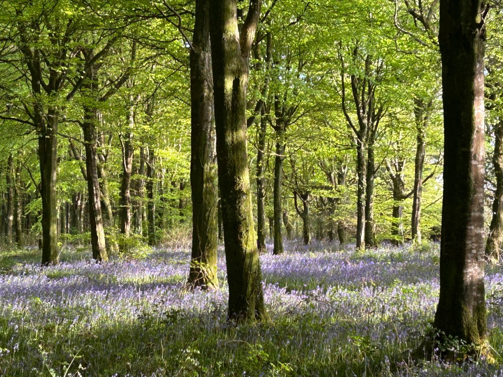 Seventy kilometres are left to me from this hill top eyrie where I am paused. The skylarks have been left behind and the only sound is a distant tractor mechanically turning a field brown. There is a small copse here, a forgotten fragment of something once much bigger, a bramble edged oasis of dark shade, the sunlight slanting through the branches and pulling blue bells up through the leaf littered floor.