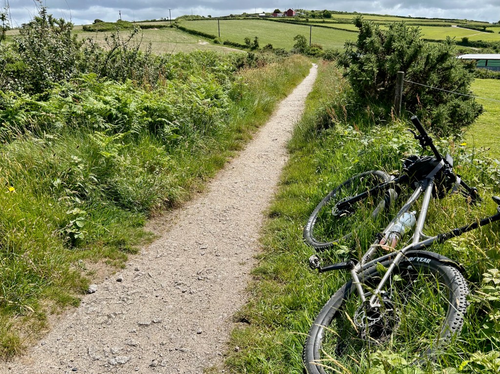 My route becomes hazardous as I follow a narrow ledge suspended between a hundred foot drop away to my left, a chaos of gullies, loose rock and capped mine shafts, and on the right a tall fence designed I suspect to stop people going off this edge. But only if they are the other side of it which I am not. The path crumbles beneath my wheels, stones sliding downhill and I hold my breath for the next twenty metres before being able to cross the fence and head on a better track down the hillside to the bottom of the Bissoe valley. That was certainly not the official route.