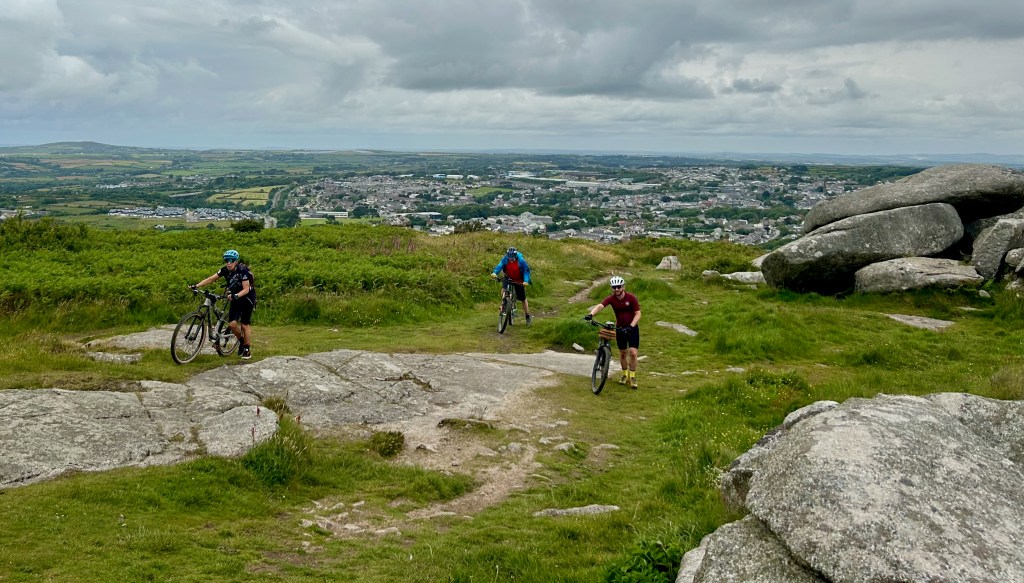 The track to the summit quickly moves from wide gravel to a difficult stepped path and only a few are capable of riding all the way. The views from the top stretch from coast to coast, especially if you climb up the pancake layers of granite around the summit tower. It could be Dartmoor or the Peak District, an open stretch of bracken and gorse with rocky outcrops or tors and between us and the sea, the rambling, chaotic Camborne-Pool-Redruth urban landscape with old mine workings, tips, industrial estates and houses jumbled together.