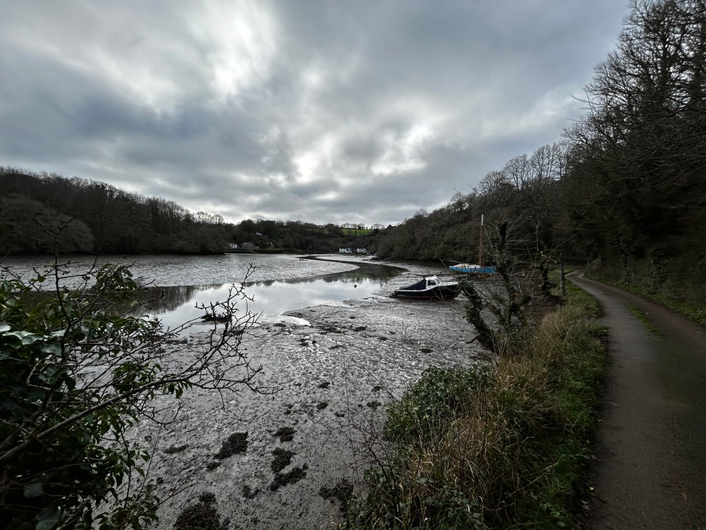 There are glimpses, unexpected panoramas of Falmouth Bay or the wider Atlantic, between the wind harried woods and sullen, empty fields.